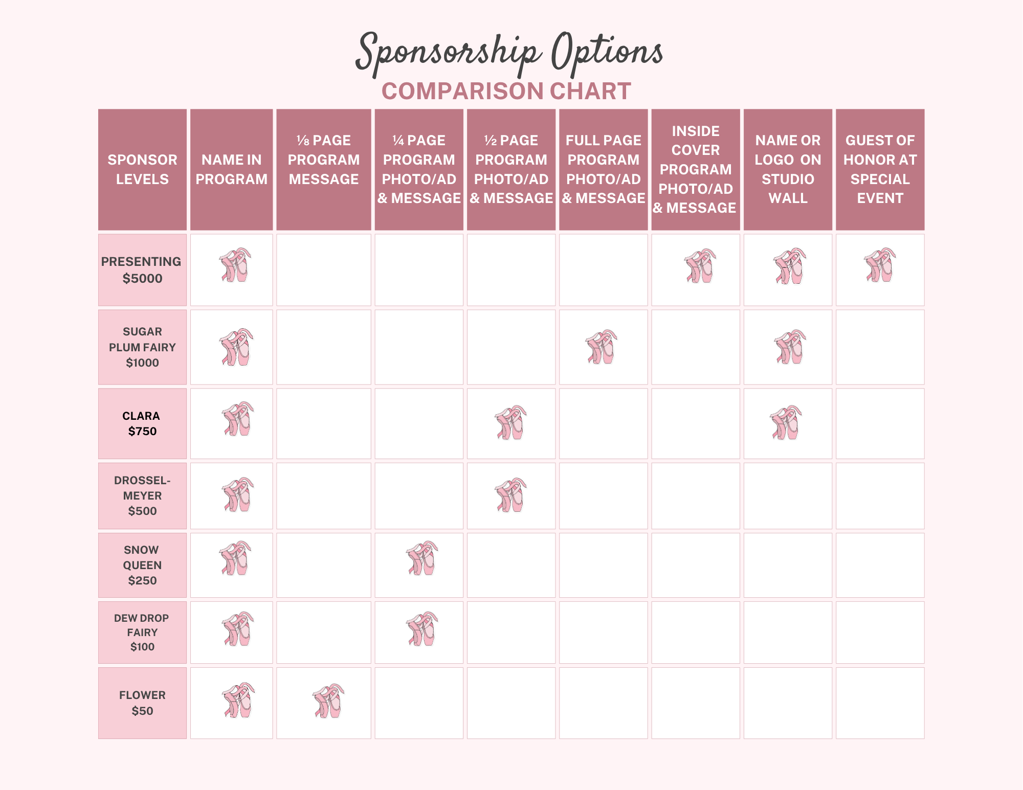 In the true spirit of The Nutcracker, we are excited to offer a “menu” of holiday sponsorship options named after beloved characters from our Land of Sweets. Enjoy perusing our sponsorship menu and advertising options! Your sponsorship makes the training, rehearsing, and performing opportunities possible for our dedicated young dance artists! Happy twirling!